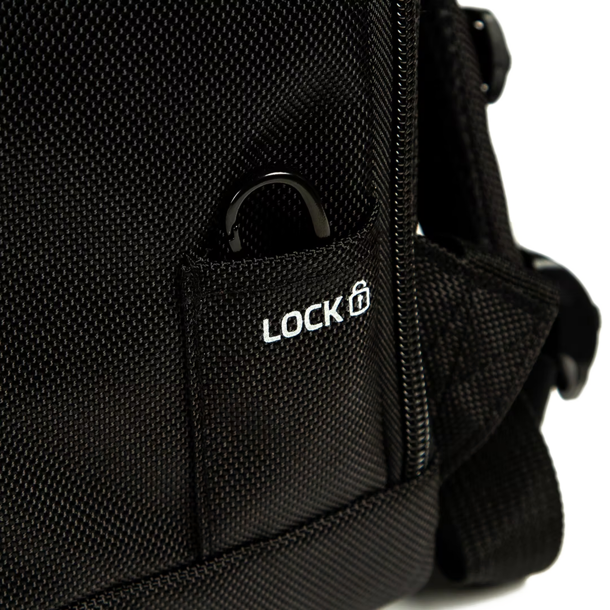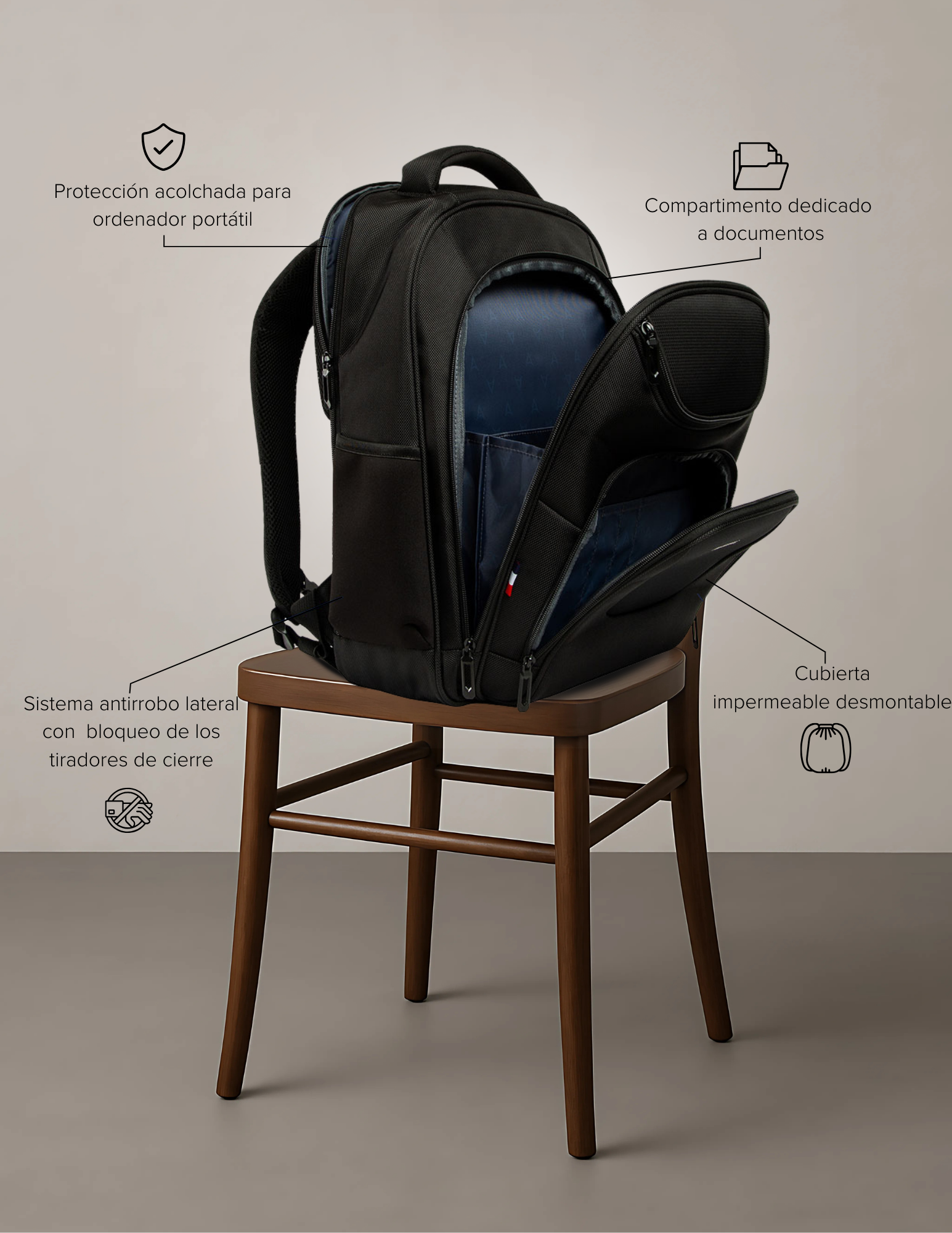 Equipped with a side compartment for a bottle or umbrella, it also includes a large padded pocket that securely protects your laptop and tablet. For your most valuable items, a hidden compartment and anti-theft lock ensure maximum protection, even in urban environments.